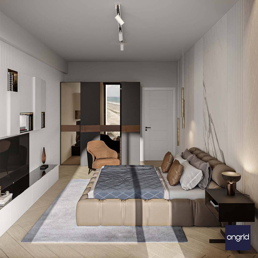 आमचे आधुनिक बेडरूमचे डिझाइन शैली, आराम आणि कार्यक्षमतेचे सुसंवादी मिश्रण आहेत. प्रत्येक घटक, सामग्रीच्या निवडीपासून लेआउटपर्यंत, एक विशिष्ट जागा तयार करण्यासाठी काळजीपूर्वक नियोजित आहे. आमच्या 3D प्रस्तुतीकरण सेवेसह आमच्या डिझाइन प्रक्रियेचा प्रत्यक्ष अनुभव घ्या .