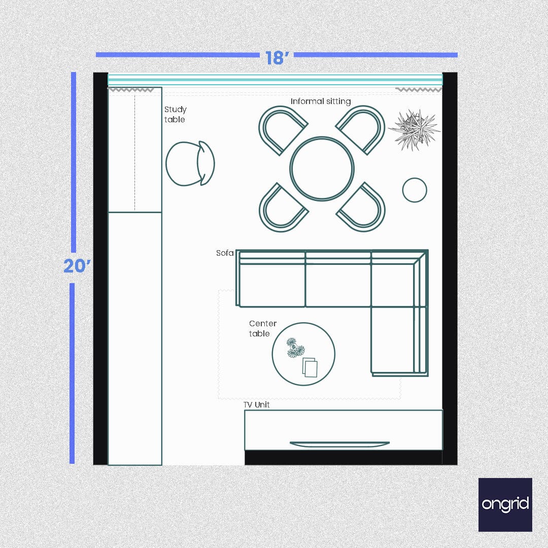20x18 जागेसाठी आमच्या किमान लिव्हिंग रूम डिझाइनसह साधेपणा स्वीकारा. Ongrid Design सह शांत आणि गोंधळ-मुक्त जागा तयार करा.