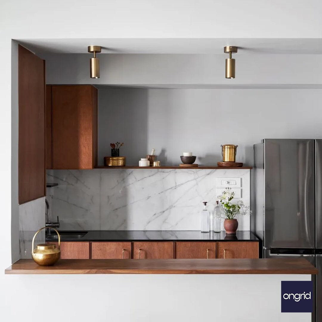 | शैली | सुतारकामातील पॉलिश प्लायवूड, खुल्या सागवानी शेल्फ् 'चे अव रुप, राखाडी रंगाचा पांढरा संगमरवरी, आणि काउंटरटॉपवर अस्तर असलेला काळा ग्रॅनाइट स्वयंपाकघरातील व्यक्तिमत्त्वाला एकत्र जोडतो. किचनच्या स्टोरेजचा बराचसा भाग लपविलेल्या पॅन्ट्रीमध्ये टाकण्यात आला आहे ज्यामध्ये बासरीयुक्त काच आणि सागवान खिशाचा दरवाजा आहे. |
