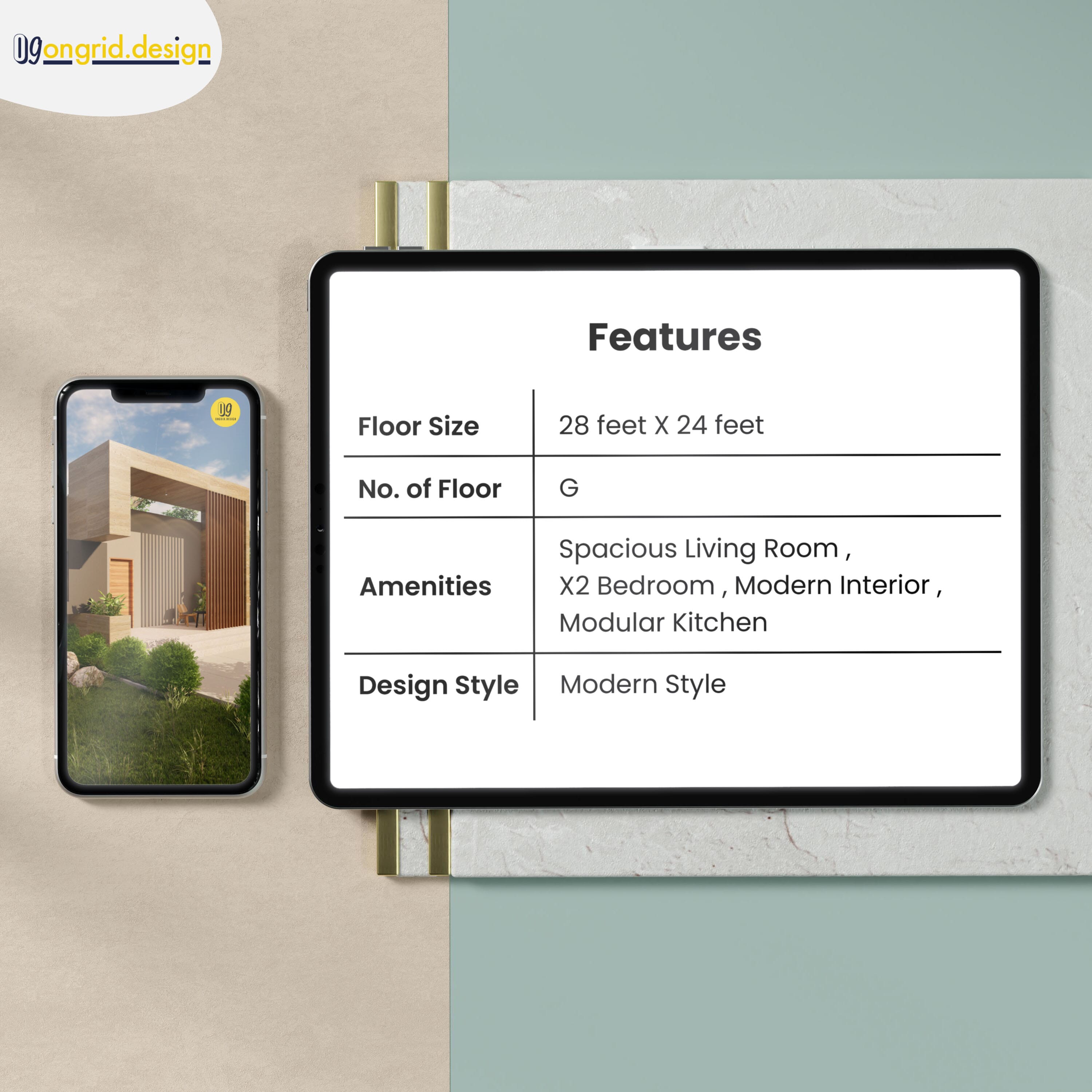 आधुनिक एलिव्हेशन घटकांसह एक मजली घर शैली, लहान आधुनिक घरे बांधू इच्छिणाऱ्या कुटुंबांसाठी योग्य आहे जे त्यांचे शनिवार व रविवार घरे आहेत. ही गृह योजना 672 चौरस फूट जागेवर दुहेरी बेडरूम आणि संपूर्ण कुटुंबाभिमुख अतिरिक्त खोल्यांसह आहे.