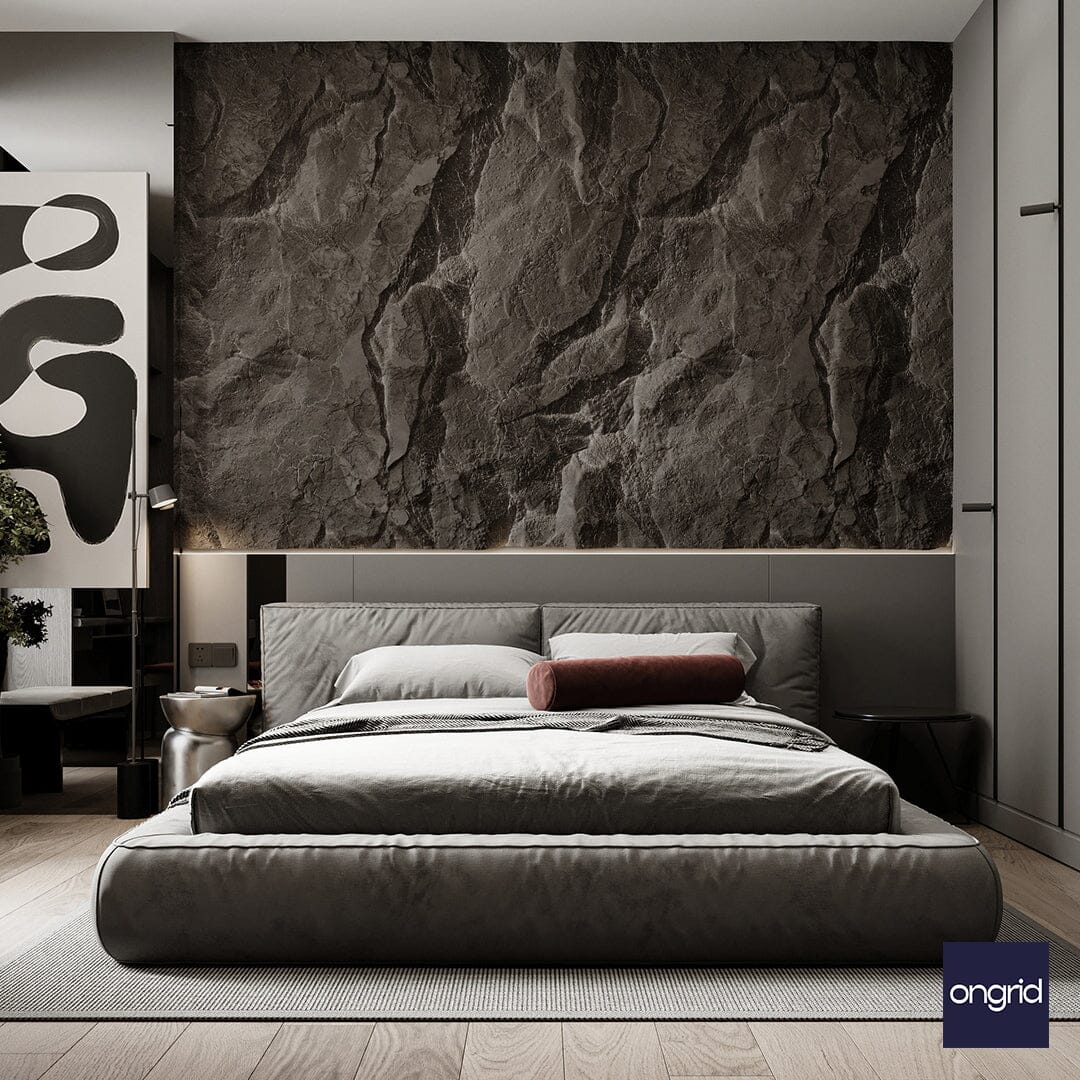 रॉक हेडवॉल नैसर्गिक लुक देण्यासाठी इतर फर्निचर आणि फॅब्रिकसह कच्चा लूक देते |