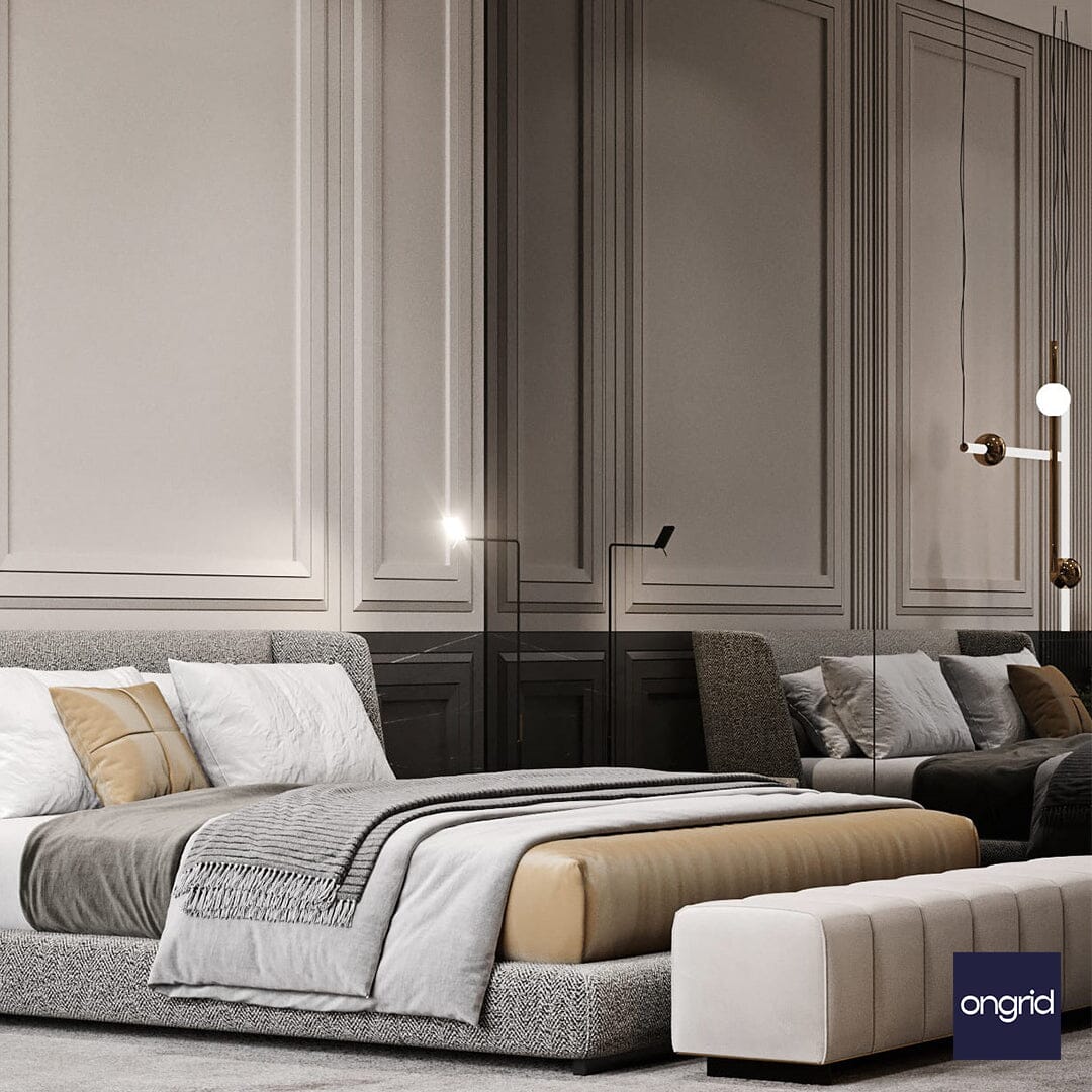 The compositional center is a wall behind the Minotti bed made of stylized panels and classic moldings complimenting the neoclassic style theme |